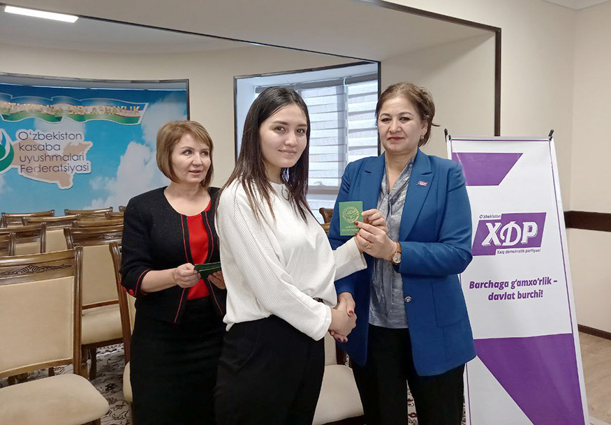 Давра суҳбати сўнггида тадбирларда фаол қатнашган бир гуруҳ хотин-қизлар тақдирланди ҳамда партия сафига қабул қилинган бир гуруҳ аёлларга аъзолик гувоҳномаси топширилди.
