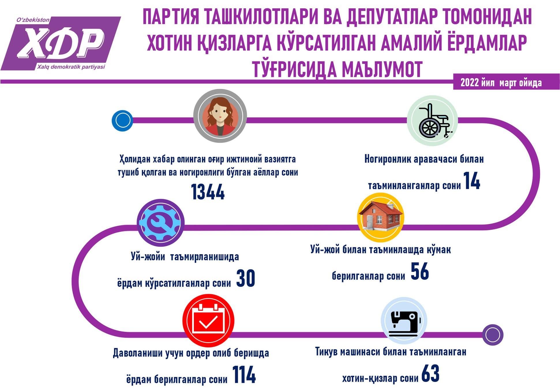 Халқ депутатлари Муборак туман Кенгашидаги ЎзХДП гуруҳи аъзолари А.Парпиева ҳамда Э.Тоировлар “Депутат маҳаллада” лойиҳаси доирасида тумандаги “Қарлиқ”, “Янгиобод” ва “Бўстон” маҳалла фуқаролар йиғинларида яшовчи эҳтиёжманд оилалар ҳолидан хабар олишиб, уларнинг муаммоларини ўрганди...