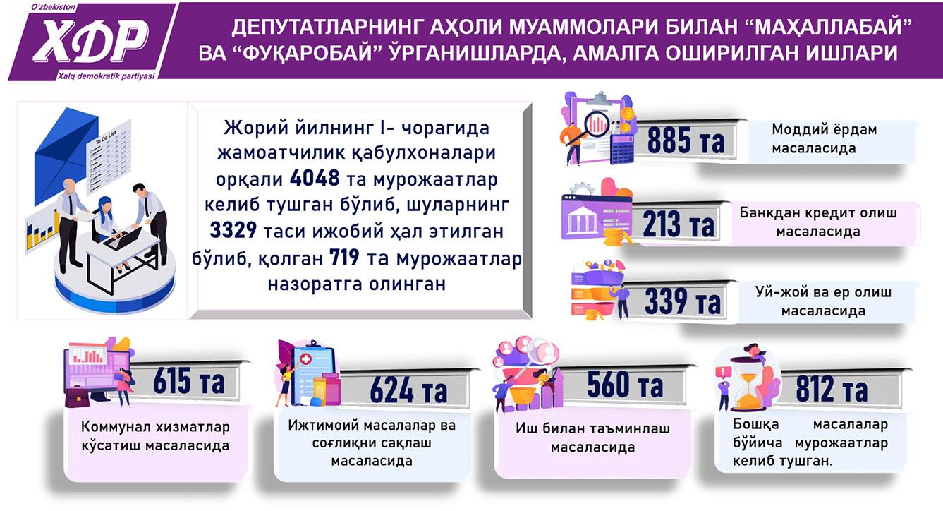 “Депутат маҳаллада” лойиҳаси доирасида халқ депутатлари Янгийўл шаҳар Кенгаши депутати, Ўзбекистон ХДП аъзоси Мавжуда Бовақулова томонидан “Мевазор” маҳалла фуқаролар йиғинида истиқомат қилувчи кам таъминланган, ногиронлиги бўлган, “Аёллар дафтари”, “Ёшлар дафтари”да рўйхатда турувчи фуқароларнинг яшаш шароити ўрганилди...