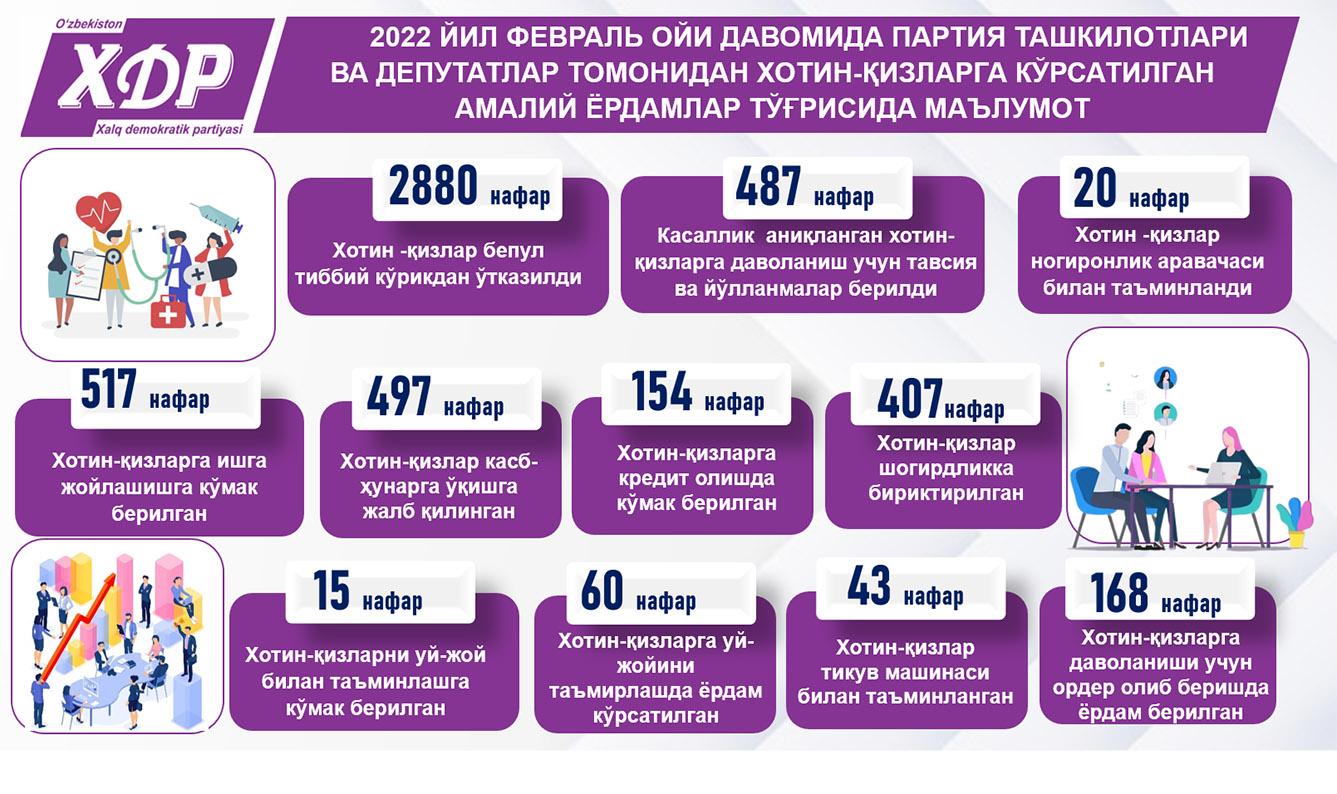 Халқ демократик партияси Бўстон туман кенгаши ташаббуси билан партия Марказий Кенгаши ташаббуси билан йўлга қўйилган “Соғлом аёл керак ҳаётга” лойиҳаси доирасида тадбир ташкил этилди...